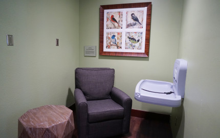 Two mothers rooms are located on the northside of our venue. A changing station and armchair are stocked in both rooms. Nursing mothers can enjoy comfortable furnishings in private, secure rooms. Signage for mothers rooms has Raised Braille to read.
